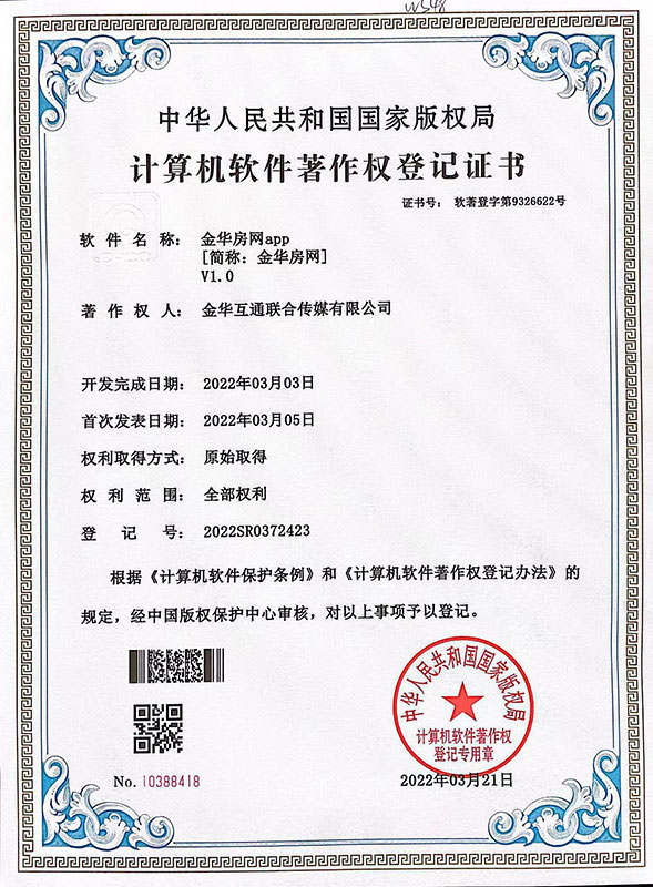 | 金华房网APP国家版权局计算机软件著作权登记证书 | 万科金华品质鉴定团团员证书 | 万科年度影响力奖 | 金华市房地产协会2023年度先进单位 |